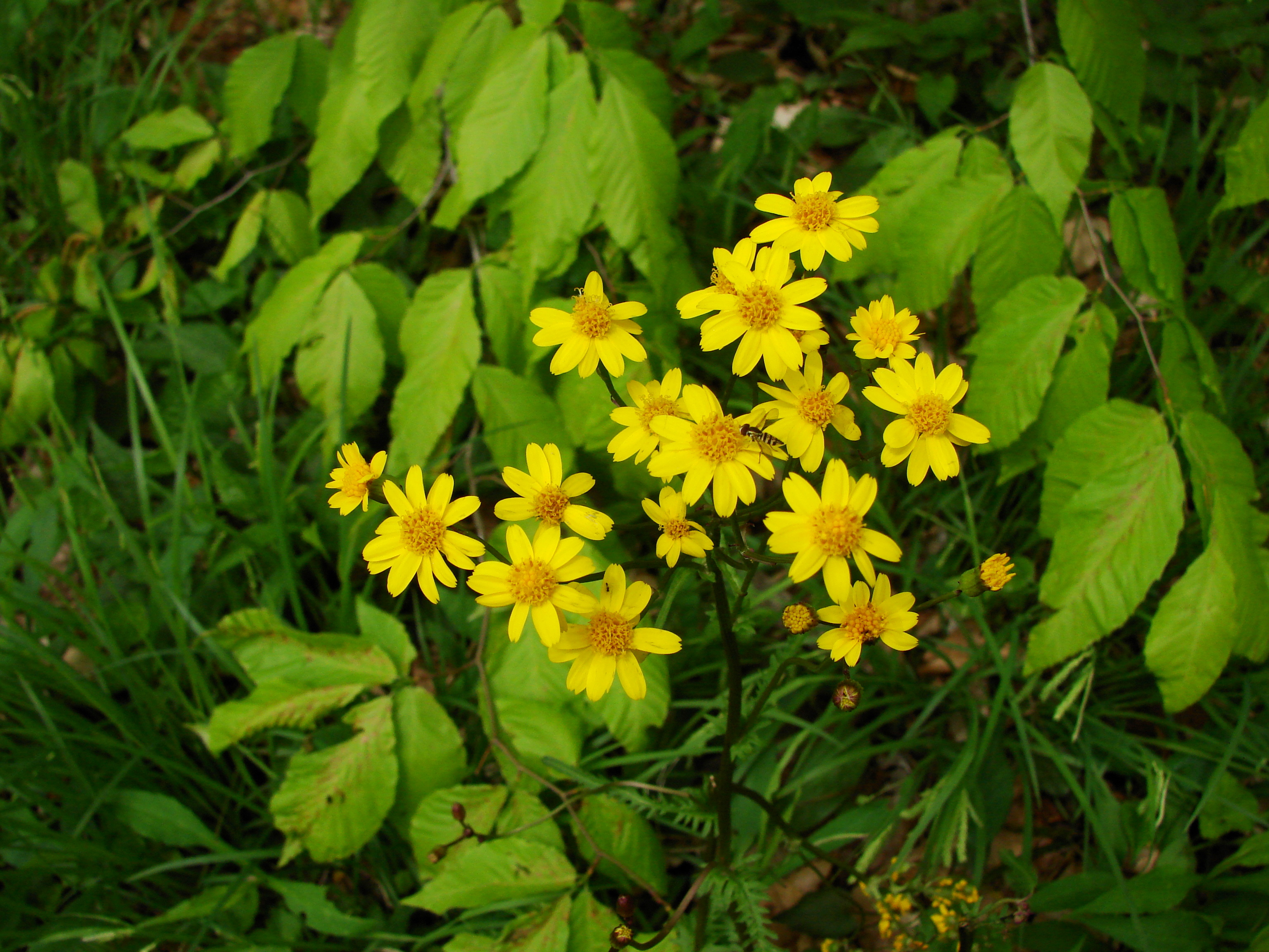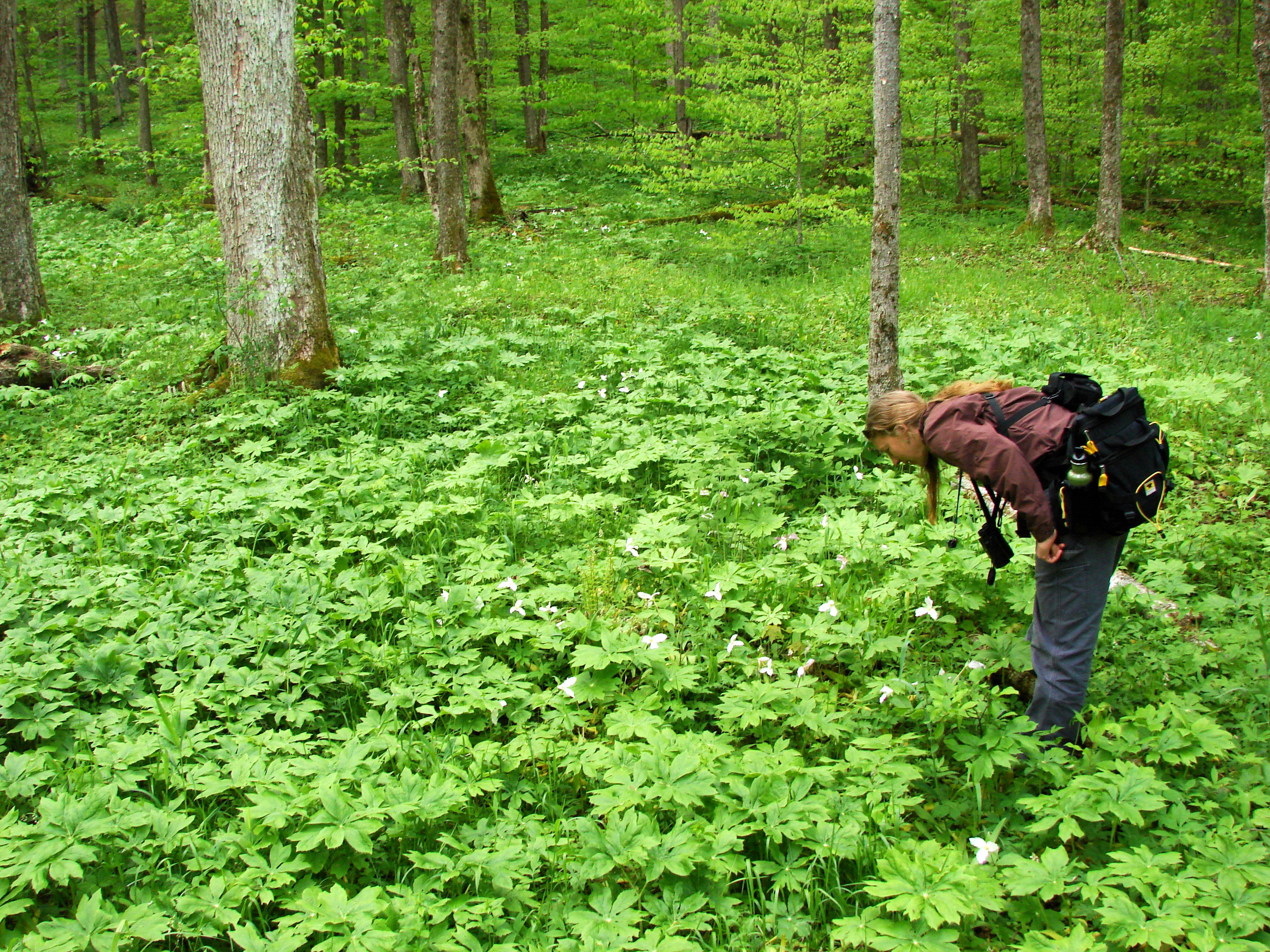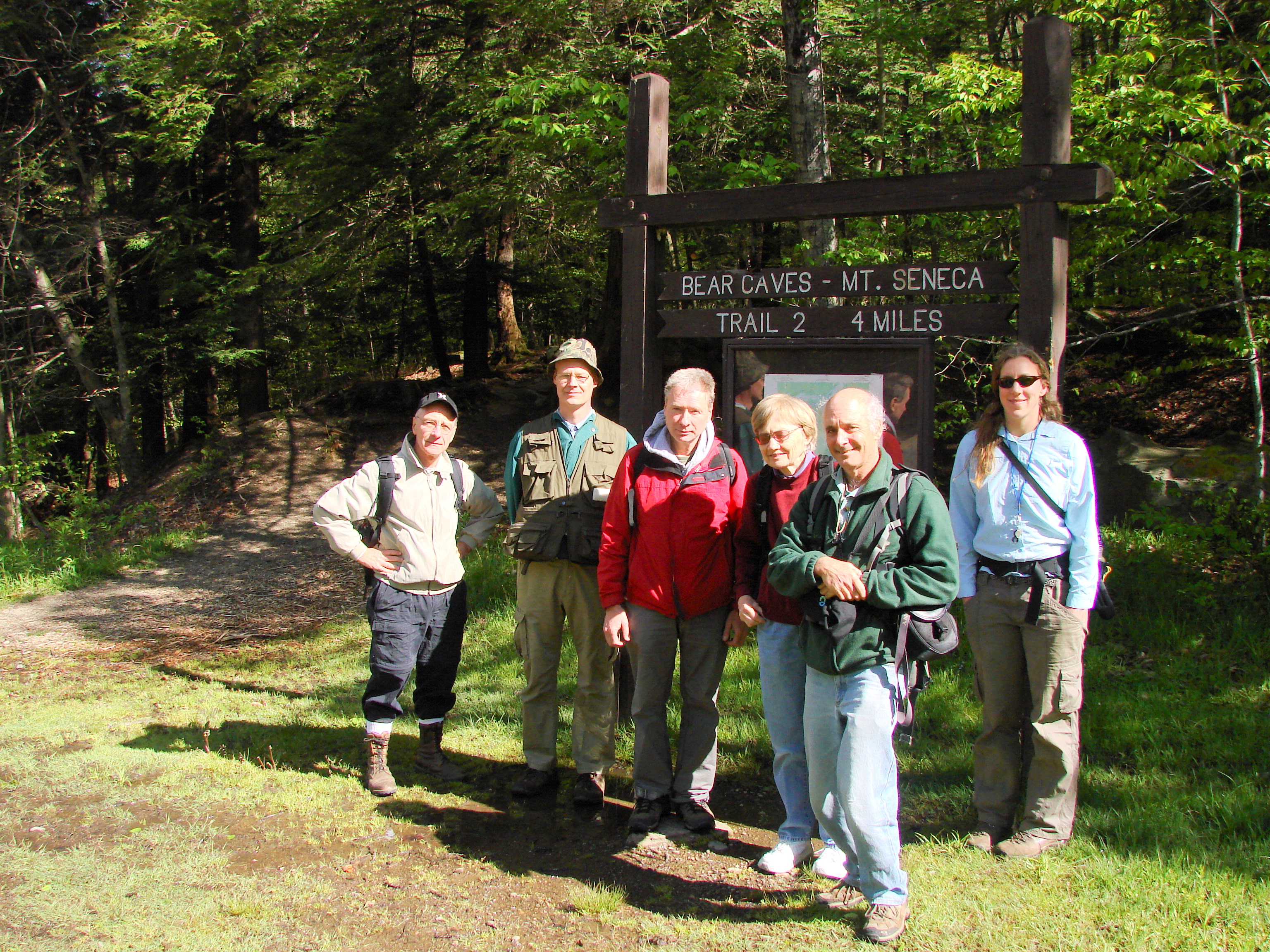 We had nine enthusiastic plant people participate in two days of plant walks in Allegany State Park. On Saturday morning May 15 we traveled to the southern end of the park and hiked up the trail to Bear Cave Rocks and Mount Seneca. At Bear Cave Rocks we wanted to confirm an old record of Trichomanes intricatum, the Weft Fern, that only occurs as a gametophyte in the cracks of the big conglomerate boulders. After searching a while with flashlights we finally found a couple of patches of the fern to everyone’s delight. We were all now part of an exclusive group of people that have ever seen this plant. After that excitement, Bear Cave Rocks lived up to its name as three bear cubs came down the trail toward us screaming for their mother. When they stopped and saw us we had a chance to photograph them before retreating back down the trail to let them leave. The east side of Mount Seneca was very rich and we saw many species of wildflowers, mosses, and ferns. Lichens were also identified by member Jim Battaglia. We all made it to the top of the mountain before descending to the bottom through a drier and less diverse forest.