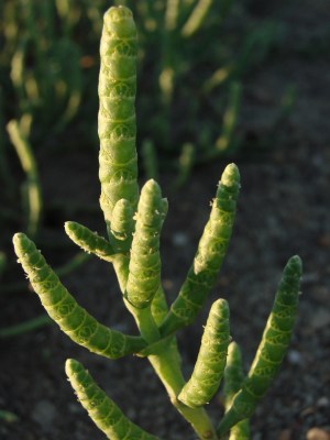 Dwarf glasswort, Salicornia bigelovii, is a single-stemmed annual with thick stems and a leaf scale that has a mucronate (pointed) tip.
