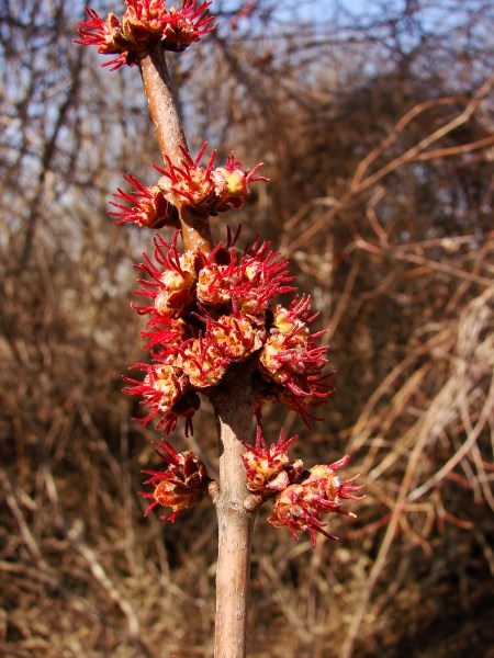 A cluster of female flowers show off their very red styles.