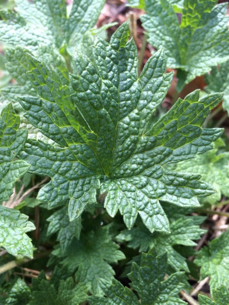 The leaves of wild geranium, Geranium maculatum, were already evident.