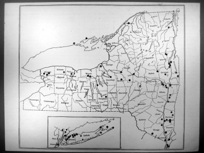 April 30, 2010Steve Young at the NY Natural Heritage Program would like to know if you have seen nodding trillium lately. There is some discussion among NY botanists that it is becoming more rare in New York and may be in trouble. If you know of any populations of this trillium with nodding white flowers let Steve know at young@nynhp.org. Historically it was known from many spots from Long Island, up the Hudson Valley and west to the Niagara Region, primarily along the limestone belts. See the map from the cards at the State Museum below.