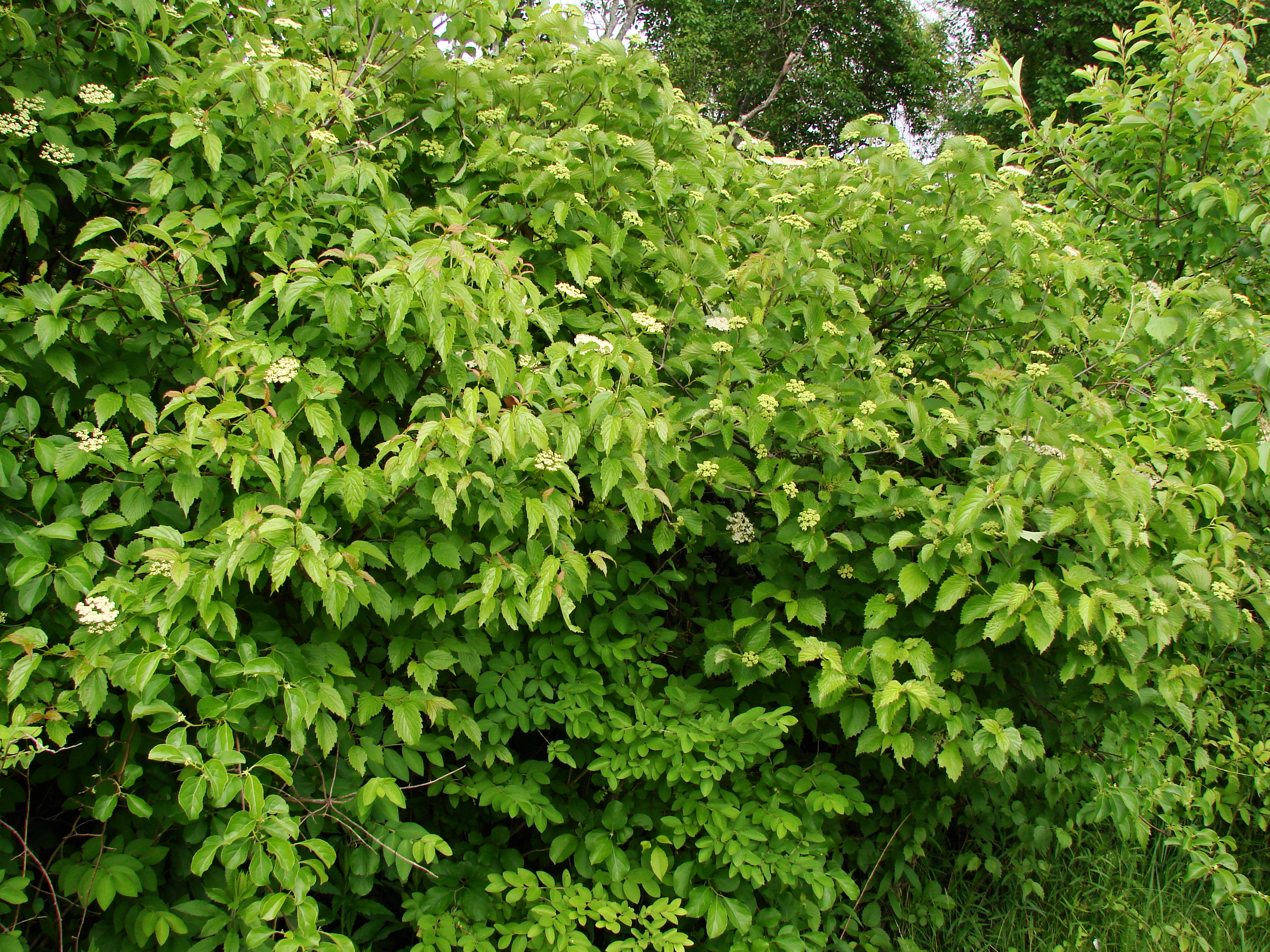 Northern and southern arrowwood beside each other. Northern on the left in bloom and southern on the right in bud in early June.