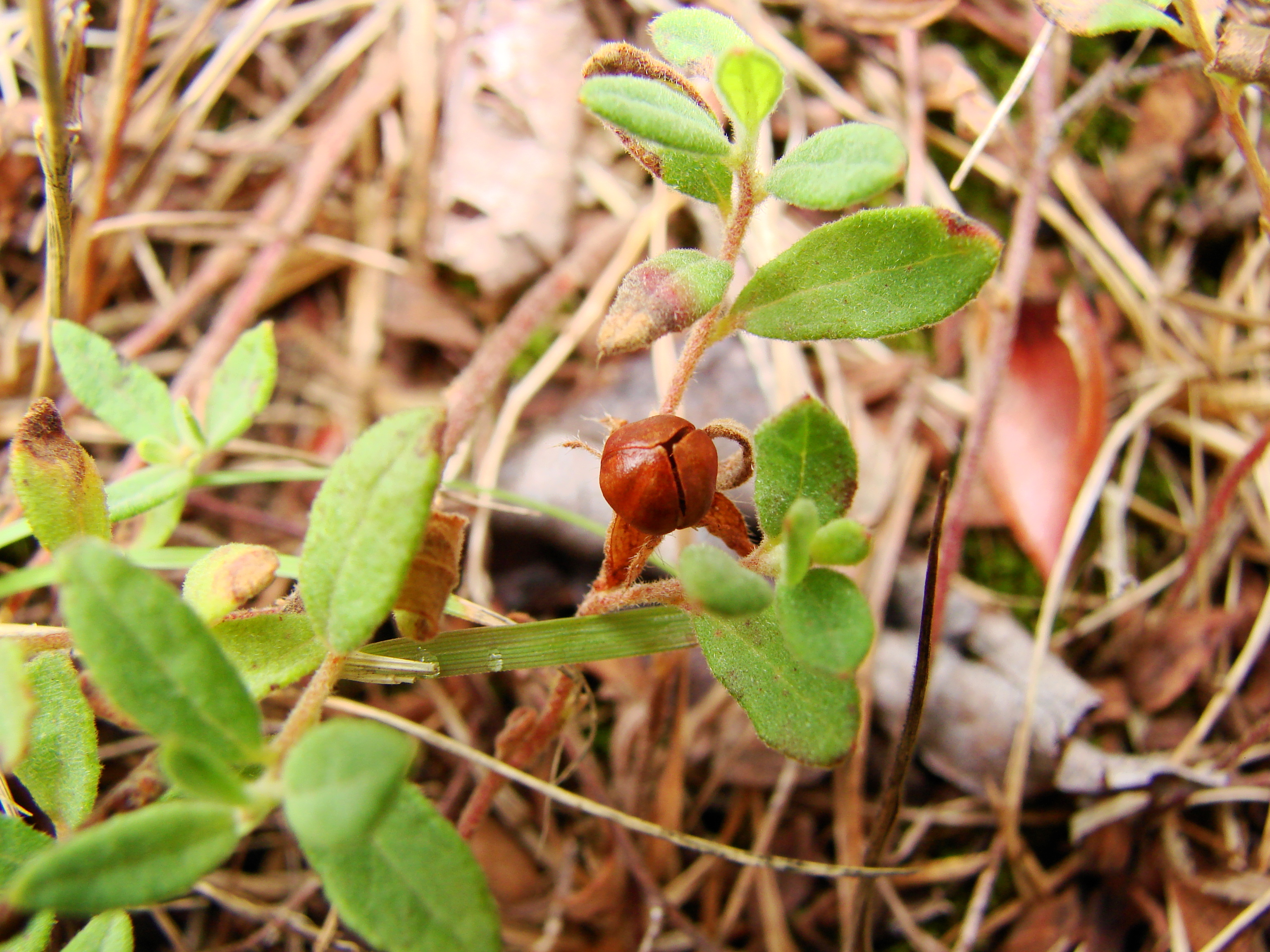 The shiny rust-colored capsule of the rare Crocanthemum dumosum, bushy rockrose help identify it in late summer.